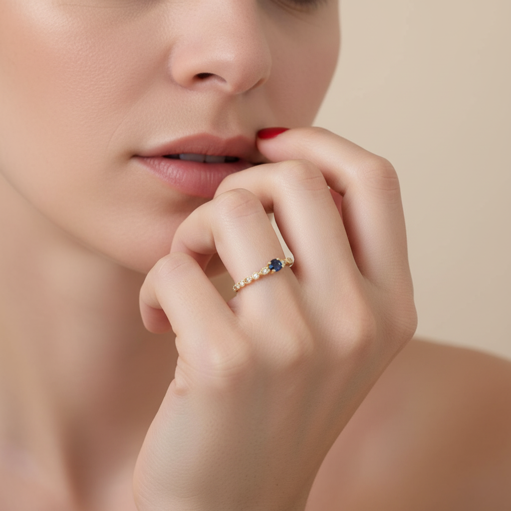 Anel com Safira Azul de 4mm e 8 Diamante de 1pt